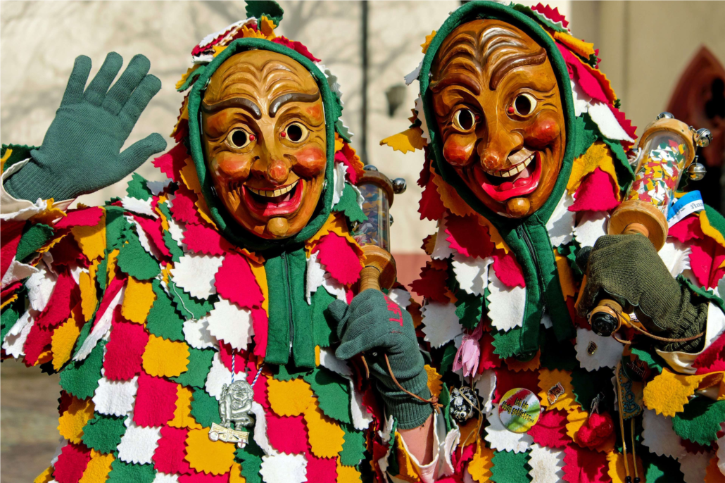 Nửa giờ sau, bỗng tiếng hò reo vang động một góc trời, người ta thấy một đoàn mặt nạ kéo đến, vừa đi vừa làm trò, coi rất ngộ nghĩnh, và không thể nhịn cười được. Kế đến những xe trá hình: xe nào cũng cắm cờ kết hoa và mỗi cái kết một hình: nào cối xay, tàu thuỷ, nào rạp hát, nhà lầu v.v… Trên xe chứa nào hề, nào đầu bếp, nào lính thuỷ, nào kẻ chăn cừu. Thực là một cảnh tượng hỗn tạp làm rối mắt mọi người! Rồi thì kèn thổi, tù va rúc, thanh la khua, như xé màng tai. Các ông tài tử trên xe uống rượu, bát nghêu. Lắm lúc hết trò, các ông quay ra thét mắng những người xem và những kẻ tò mò ở trong cửa sổ ló đầu ra. Bị chọc tức họ nhao nhao cãi lại. Đồng thời một trận mưa hoa và kẹo do người ta ném lẫn nhau, bay phơi phới, đám rước còn dài, xa trông chỉ thấy cờ bay phất phới, lông mũ lung lay và những đầu người lắc lư dưới những cái mũ nhọn khổng lồ.
