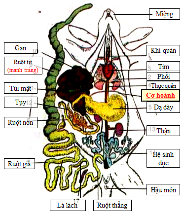 - Miệng, thực quản, dạ dày, ruột non, manh tràng ( tiêu hóa thức ăn xenlulô) , ruột già