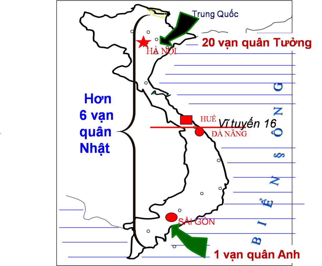 - Từ vĩ tuyến 16 trở ra Bắc, hơn 10 vạn quân Tưởng Giới Thạch và bọn tay sai phản động ồ ạt kéo vào nước ta, âm mưu lật đổ chính quyền cách mạng, thành lập chính quyền tay sai.